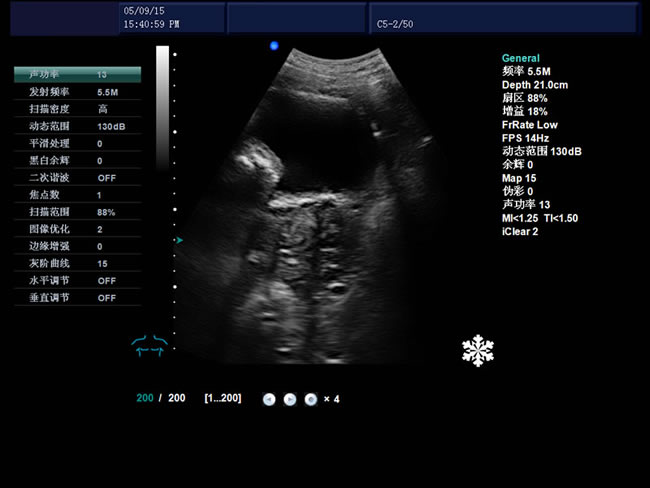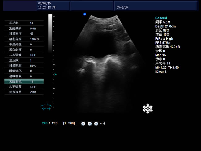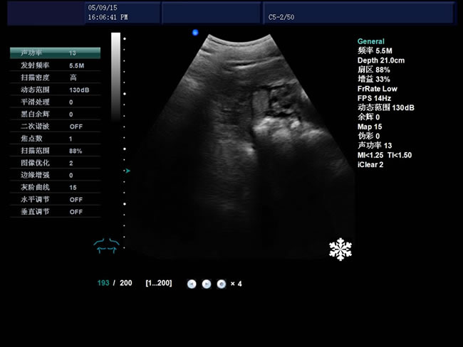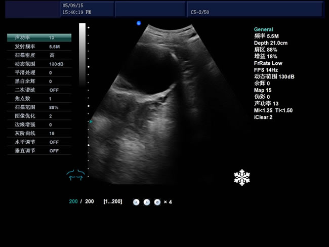 頻率、幀頻、B模式總增益、C模式總增益、D模式總增益、菜單、注釋、灰階帶、穿刺引導(dǎo)線、PRF、壁濾波、血流相關(guān)、累積次數(shù)、TI熱指數(shù)、MI機(jī)械指數(shù)